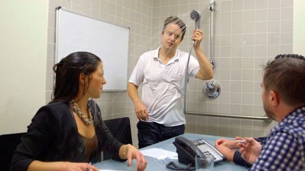 Po zakończeniu prac zespół kreatywny działającej w Providence agencji Nail zebrał się na spotkaniu w pokoju, który tymczasowo otrzymał przewrotną nazwę „(b)Rainstorm”. Po rozpoczęciu narady szef agencji bez zbędnego wahania zdjął prysznic z uchwytu i spokojnie polewał nim zarówno siebie, jak i swoich współpracowników. Większość z nich zniosła ze stoickim spokojem potoki wody lejące się na głowę, choć niektóre panie miały kłopot związany z rozpływającym się i szczypiącym w oczy makijażem.