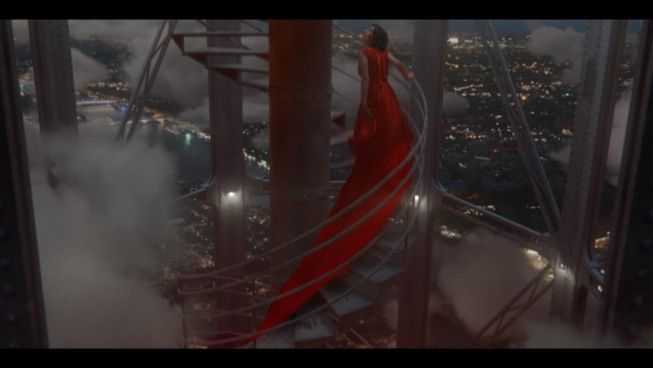 W ostatniej scenie kobieta dociera na sam szczyt wieży, z której rozpościera się bajkowy widok morza chmur, przywołujący moment poza czasem, który można poczuć tylko w samolocie. Długi tren sukni ulatuje na wietrze i znikając pozostawia mały czerwony akcent – symbol linii Air France. Film kończy nowe hasło reklamowe przewoźnika: "Elegancja jest podróżą. Air France".