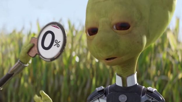 W spocie z kampanii para kosmitów zaraz po wylądowaniu na polu dzięki aplikacji mobilnej przywołuje znanego z wielu reklam Alior Banku pracownika w stroju charakterystycznym dla tego banku.