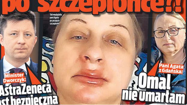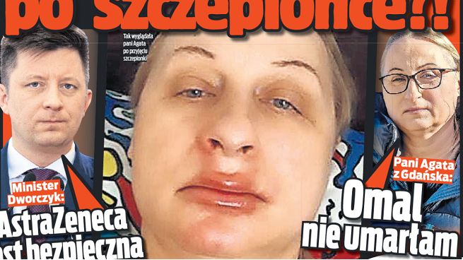 Na pierwszej stronie sobotnio-niedzielnego wydania „Faktu” napisano, że 50-letniej mieszkance Gdańska po przyjęciu szczepionki firmy AstraZeneca na covid-19 spuchła twarz. Kobieta trafiła do szpitala, lekarze podejrzewają u niej problemy zakrzepowe.