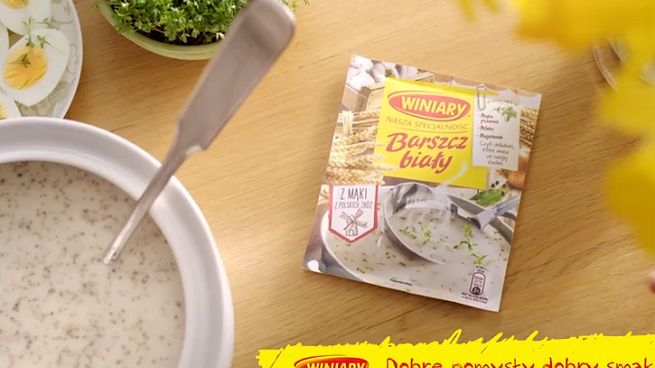 Spot Barszczu Białego Winiary pokazuje przygotowywanie tej zupy na rodzinny obiad. Podkreśla przy tym, że zawiera ona mąkę z polskich zbóż, majeranek i czosnek. Reklama nawiązuje do zbliżającej się Wielkanocy, zaznaczając, że promowany barszcz można jeść „nie tylko od święta”.