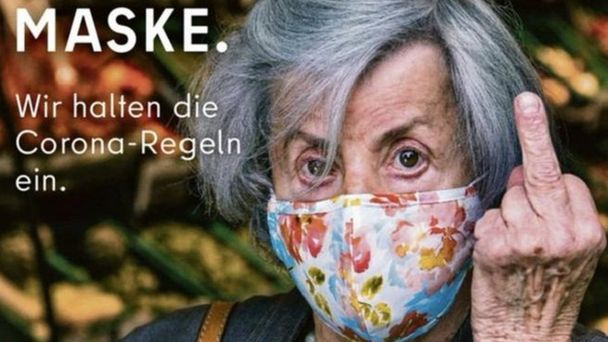 Mocną kampanię społeczną na temat obowiązku noszenia maseczek ochronnych przygotowały władze Berlina we współpracy z i organizacją Visit Berlin. Na plakacie widać starszą panią - czyli osobę z grupy największego ryzyka ciężkiego przebiegu COVID-19 - która trzyma rękę z wysuniętym środkowym palcem. Obraźliwy gest kierowany jest do wszystkich tych, którzy świadomie nie chcą dostosować się do zasad wspólnego bezpieczeństwa, odmawiając zasłaniania maseczką ust i nosa.