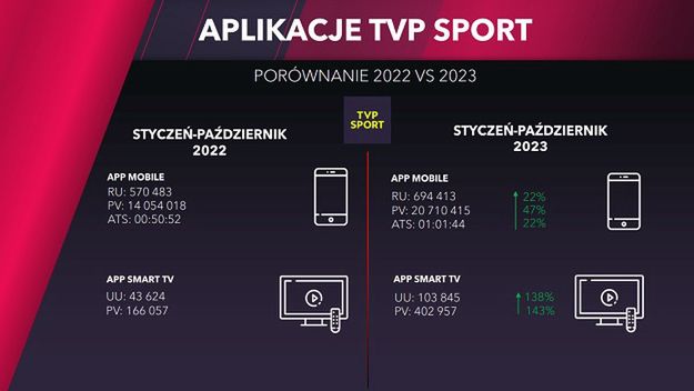 Jak podaje BR TVP, w czasie trwania Mistrzostw Świata w piłce nożnej, w okresie od 20 listopada do 18 grudnia 2022 roku aplikacja mobilna TVP Sport wygenerowała 68 mln odsłon oraz zasięg ponad 1,4 mln unikalnych użytkowników (UU), a na connected tv ponad 12 mln odtworzeń, przy 193 tys. unikalnych użytkownikach (UU).