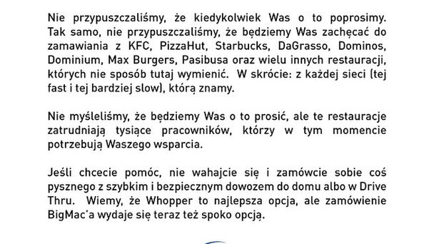 - Nie przypuszczaliśmy, że kiedykolwiek Was o to poprosimy. Tak samo, nie przypuszczaliśmy, że będziemy Was zachęcać do zamawiania z KFC, Starbucks, DaGrasso, Dominos, Dominium, Max Burgers, Pasibusa oraz wielu innych restauracji, których nie sposób tutaj wymienić. (…) Jeśli chcecie pomóc, nie wahajcie się i zamówcie sobie coś pysznego z szybkim i bezpiecznym dowozem do domu albo Drive Thru. Wiemy, że Whopper to najlepsza opcja, ale zamówienie BigMac'a wydaje się teraz też spoko opcją - czytamy na polskim profilu Burger Kinga.