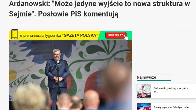 W piątek, 16 października br. w portalu Niezależna.pl ukazał się tekst autora podpisanego jako Przemysław Obłuski „Ardanowski: >>Może jedyne wyjście to nowa struktura w Sejmie". Posłowie PiS komentują<<”. W artykule przytoczono fragmenty wypowiedzi byłego ministra rolnictwa oraz zestawiono je z komentarzem posła Marka Suskiego, wiceprzewodniczącego klubu parlamentarnego Prawa i Sprawiedliwości.
