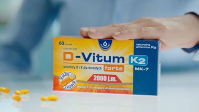 W spocie o zaletach suplementu diety D-Vitum Forte K2 przekonuje kobieta. Informuje ona, że promowany produkt zawiera olej lniany z wysoką zawartością kwasów tłuszczowych omega-3 oraz witaminami D i K2.