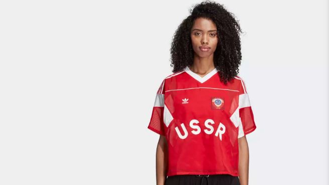 Natomiast opis „dwukolorowej koszulki z motywem piłkarskim z 1991 r. ZSRR” brzmi następująco: „Dopasowany krój inspirowany wyglądem damskiej koszulki (z czasów ZSRR). Stworzony według wzoru koszulek piłkarskich Związku Radzieckiego w 1991 roku”. Koszulka ma na sobie grafikę ZSRR i numer 9 z tyłu.