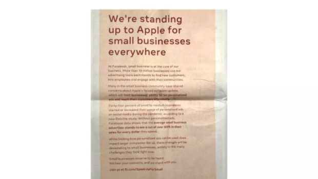 Reklamy zatytułowane „Bronimy małe biznesy przed Apple” przestrzegają, że zapowiadane przez Apple nowe rozwiązania uderzą przede wszystkim w małe i średnie przedsiębiorstwa, które zostaną pozbawione możliwości skutecznego dotarcia z przekazem reklamowym do klientów, co może okazać się szczególnie bolesne w czasach pandemii i kryzysu gospodarki.