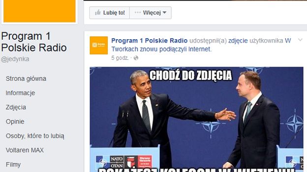 Mem oparty na zdjęciu ze wspólnej konferencji prasowej Andrzeja Dudy i Baracka Obamy podczas szczytu NATO pojawił się na fanpage’u Jedynki w niedzielę o godz. 14:07. Grafikę udostępniono z satyrycznego fanpage’a „W Tworkach znowu podłączyli Internet”.