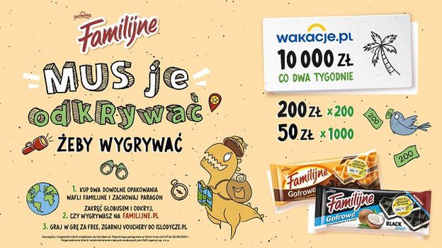 Aby wziąć udział w loterii, należy kupić 2 dowolne opakowania wafli i zarejestrować paragon na stronie familijne.pl . „Mus je odkrywać, żeby wygrywać" to aktywacja, w której co dwa tygodnie można wygrać voucher Wakacje.pl na rodzinne wczasy o wartości 10 000 zł. Na zwycięzców czekają również nagrody pieniężne. Łączna pula nagród to ponad 150 tys. zł.