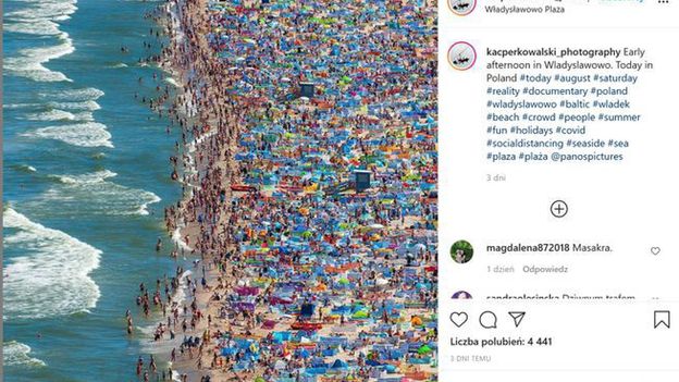 Zdjęcie Kacpra Kowalskiego ukazujące gęsto zatłoczoną plażę we Władysławowie ukazało się weeekend na jego profilu na Instagramie. Zostało wielokrotnie udostępnione przez innych użytkowników aplikacji jako dowód nieprzestrzegania dystansu społecznego przez Polaków na plażach.