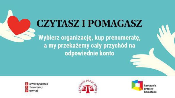 Beneficjentami akcji są: Kampania Przeciw Homofobii, Centrum Praw Kobiet oraz Stowarzyszenie Interwencji Prawnej. Każdy, kto kupi pakiet „Wyborcza” lub „Wyborcza Premium”. Na stronie akcji "Czytasz i pomagasz!" - Wyborcza.pl/pomagamy, można wskazać organizację, która otrzyma przychód z danej prenumeraty.