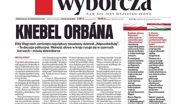 Na pierwszej stronie „GW” znalazł się też tekst opisujący zamknięcie węgierskiego dziennika. Jego ostatni numer ukazał się w sobotę, potem zamknięto redakcję pod pozorem przeprowadzki, a dziennikarze korespondencyjnie dostali wypowiedzenia. Wydawca oficjalnie uzasadnił zawieszenie gazety jej słabymi wynikami finansowymi. W sobotę i niedzielę w Budapeszcie odbyły się manifestacje przeciw tej decyzji.