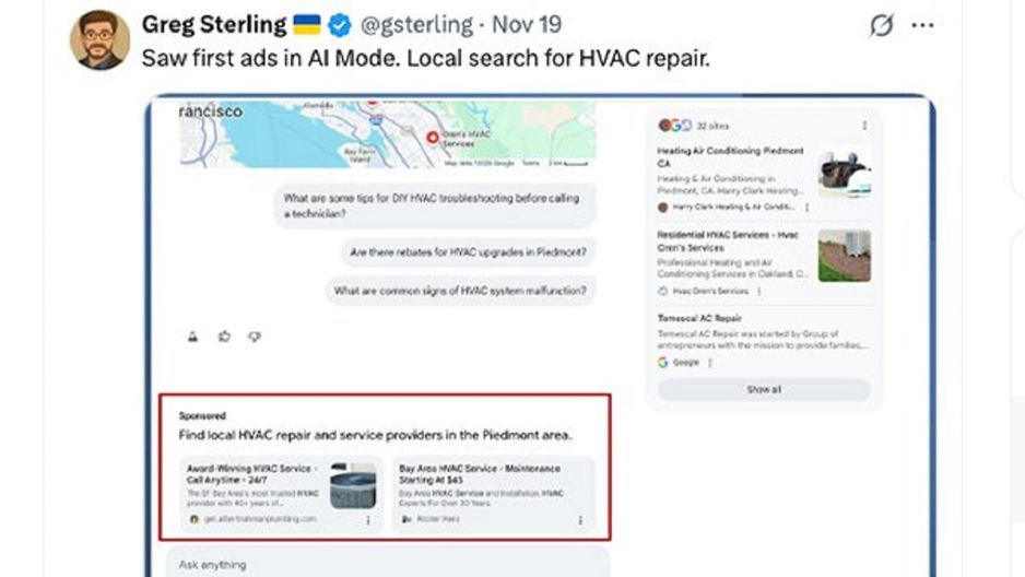 Pierwsze sygnały o reklamach w AI Mode pojawiły się w interfejsie Google Labs. Greg Sterling z Near Media zauważył je przy wyszukiwaniu usług HVAC, a Brodie Clark, konsultant SEO współpracujący z TripAdvisor, potwierdził podobne wyniki poza trybem eksperymentalnym przy zapytaniu o hydraulika.