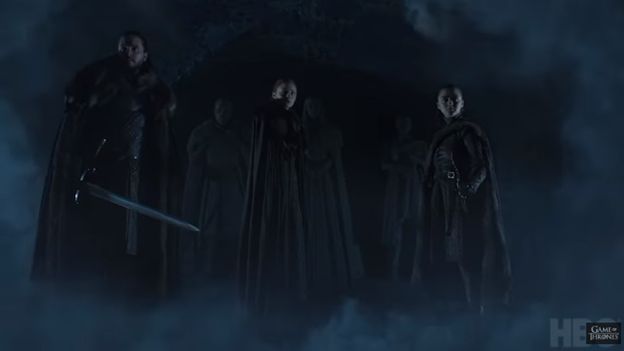 Bohaterami pierwszego oficjalnego teasera są Jon (Kit Harington), Arya (Maisie Williams) oraz Sansa (Sophie Turner). Obserwują swoje posągi w kryptach Winterfell. Muzyczne tło stanowi kompozycja Ramina Djawadi'ego, który otrzymał Emmy w 2018 roku za muzykę do siódmego sezonu serialu.