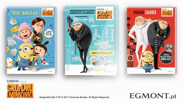 W ofercie Egmont pojawi się także kilka książek: „Ilustrowana opowieść”, „Biblioteka filmowa”, „Gru, Dru i Minionki. 1000 naklejek”, „Księga zagadek”, „Przewodnik po tajnych gadżetach i pojazdach oraz innych superowych rzeczach!”, „Księga łamigłówek”, „Superkolorowanki”, „Superalbum z naklejkami” czy „Książka z tatuażami”.