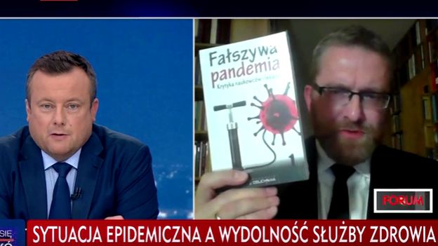 Od początku ostatniego wydania „Forum” w TVP Info Grzegorz Braun, zabierając głos, za każdym razem trzymał blisko twarzy okładkę książki „Fałszywa pandemia”. Zapewnił, że zawarte są w niej wiarygodnie tezy naukowców o prawdziwym przebiegu epidemii koronawirusa, podważające powszechne dane na ten temat.