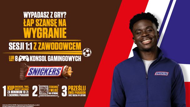 Kluczowym elementem kampanii jest też loteria konsumencka, w której uczestnicy mają szansę wygrać udział w zorganizowanym spotkaniu z Bukayo Saką. Jak można przystąpić do loterii? Do 1 czerwca 2025 roku należy dokonać potwierdzonego paragonem zakupu w punkcie sprzedaży dowolnych batonów Snickers, Twix, Mars lub Bounty za kwotę min. 10 zł lub do 1 czerwca 2025 roku dokonać, potwierdzonego paragonem, zakupu w sklepie sieci Biedronka dowolnych batonów Snickers, Twix, Mars lub Bounty za kwotę min. 10 zł.
