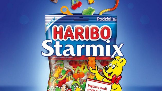 Haribo Starmix to kompozycja 6 rodzajów żelek w jednej paczce. W opakowaniu znajdują się kultowe Złote Misie Haribo, żelki Happy Cola, wisienki, podłużne dżdżownice, dwuwarstwowe żabki oraz żelki-smoczki.
