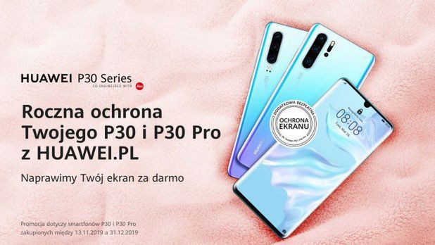 W ramach promocji, osoby, które w okresie od 13 listopada do 31 grudnia br. kupią smartfona Huawei P30 lub P30 Pro w sklepie internetowym huawei.pl, otrzymają dodatkowo roczną gwarancję na ekran, która pozwala bezpłatnie naprawić wyświetlacz w wybranym serwisie marki, również z wykorzystaniem usługi door-to-door.