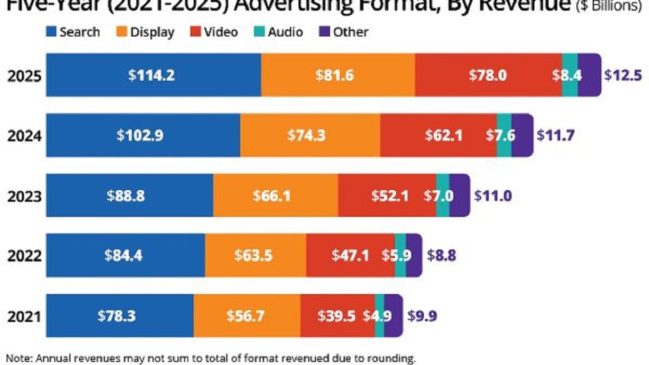 Największy wzrost dotyczy reklam w mediach społecznościowych: 117,7 mld dol., wzrost o 32,6 proc. rok do roku. Wideo cyfrowe osiągnęło 78,0 mld dol., także +32,6 proc., przy czym IAB podaje, że szeroka kategoria wideo (CTV, social video, online i short‑form) urosła o 25,4 proc. r/r. Reklama w wyszukiwarce wyniosła 114,2 mld dol. (+11 proc.), a commerce media 63,4 mld dol. (+18 proc.). Programmatic sięgnął 162,4 mld dol. (+20,5 proc.). Podcasty zanotowały 2,9 mld dol. (+17,6 proc.), a display 81,6 mld dol. (+9,8 proc.).