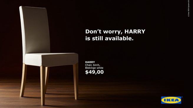 Pierwsza reklama promuje krzesła, które ma w swojej ofercie IKEA. Noszą nazwę Harry. Marketer przekonuje w niej: „Nie martw się, Harry jest nadal dostępny”.