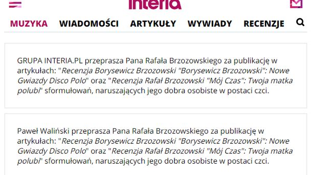 - Grupa Interia.pl przeprasza Pana Rafała Brzozowskiego za publikację w artykułach: „Recenzja Borysewicz Brzozowski "Borysewicz Brzozowski": Nowe Gwiazdy Disco Polo” oraz „Recenzja Rafał Brzozowski "Mój Czas": Twoja matka polubi” sformułowań, naruszających jego dobra osobiste w postaci czci - komunikat takiej treści przeczytali w zeszły weekend użytkownicy portalu Muzyka.interia.pl. Opublikowano też identyczne przeprosiny od Pawła Walińskiego, dziennikarza muzycznego i autora obu recenzji albumów wokalisty.