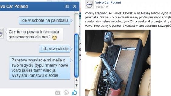 Scan pokazuje, jak w środę jeden z użytkowników Facebooka, Tomek Atlowski, napisał wiadomość do administratorów profilu Volvo Car Poland, że w sobotę wybiera się na paintball. Kiedy ci wyrazili zaskoczenie, że przesłał im taką informację, wyjaśnił, że skoro firma pisze do niego regularnie o sobie (np. o nowych modelach samochodów), postanowił zrewanżować się tym samym.