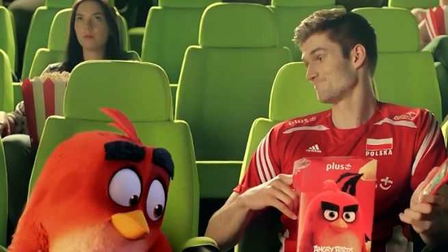 Reklama informująca o promocji pokazuje, jak w sali kinowej siatkarz Karol Kłos spotyka się z jednym z bohaterów „Angry Birds”.