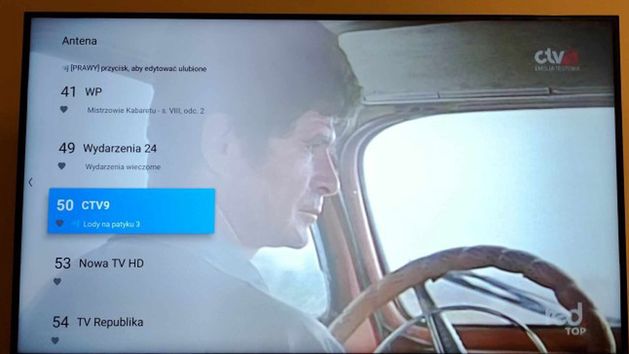1. TVP1 (MUX-3)  2. TVP2  (MUX-3)  3. TVP3 (MUX-3)  4. Polsat (MUX-2)  5. TVN (MUX-2)  6. TV4 (MUX-2)  7. TV Puls (MUX-2)  8. TVN7 (MUX-2)  9. Puls 2 (MUX-2)  10. TV6 (MUX-2)  11. Super Polsat (MUX-2)  12. Eska TV (MUX-1)  13. TTV (MUX-1)  14. Polo TV (MUX-1)  15. Antena HD (MUX-1)  16. TV Trwam (MUX-1) 17. Stopklatka (MUX-1)  18. Fokus TV (MUX-1)  19. TVP Polonia (MUX-6)  20. TVP Nauka (MUX-6)  24. TVP Dokument (MUX-6)  27. TVP Rozrywka (MUX-6)  28. Alfa TVP (MUX-6)  29. TVP ABC (MUX-3)  30. TVP Kultura (MUX-3)  31. TVP Historia (MUX-3)  32. TVP Sport (MUX-3) 33. TVP World (MUX-6) 34. TVP Info (MUX-3) 35. TVP Kobieta (MUX-6)  36. Belsat TV (MUX-6)  38. Metro (MUX-8)  39. Zoom TV (MUX-8)  40. Nowa TV (MUX-8) 41. WP (MUX-8)  49. Wydarzenia 24 (MUX-1)  50. CTV9 (MUX-8)  53. Nowa TV HD (MUX BCAST)  54. TV Republika (MUX BCAST) 56. StarsTV HD (MUX BCAST)  57. EWTN (MUX BCAST) 59. TV Okazje HD (MUX BCAST) 62. TV Regionalna (MUX BCAST)  63. Polsat HD (MUX BCAST)  86. CDA Premium (MUX-8, aplikacja HbbTV) 88. TVP GO (MUX-3, aplikacja HbbTV)  89. Legia TV (MUX-8, aplikacja Legii Warszawa w HbbTV)  90. EWTN GO (MUX-8, aplikacja HbbTV)  91. TVP World (MUX-3, kanał wirtualny przez HbbTV)  92. TVP ABC 2 (MUX-3, kanał wirtualny przez HbbTV)  93. TVP Historia 2 (MUX-3, kanał wirtualny przez HbbTV)  94. TVP Kultura 2 (MUX-3, kanał wirtualny przez HbbTV)  95. UA Perszyj (MUX-8, kanał wirtualny przez HbbTV)  96. test5 (MUX-8, czarny ekran)  97. test6 (MUX-8, czarny ekran)  98. EmiRadio (MUX-8, aplikacja ze stacjami radiowymi w HbbTV)  99. EmiTV (MUX-8, aplikacja z programem telewizyjnym w HbbTV)  118. Polsat News Polityka (MUX-4)  333. Polsat HbbTV (MUX-4, promo kanałów Polsatu w HbbTV)
