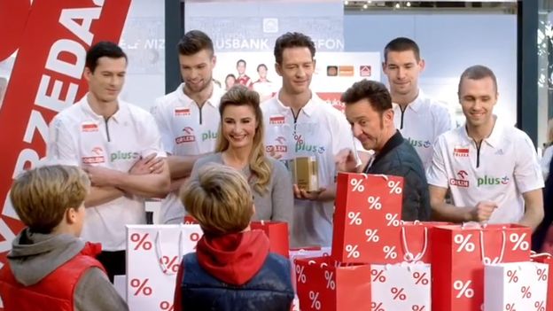 W spocie Joanna Brodzik i Paweł Wilczak po zakupach w centrum handlowym trafiają na stos prezentów, przy przeniesieniu których pomagają im siatkarze reprezentacji Polski na czele z trenerem Stephane’em Antigą.
