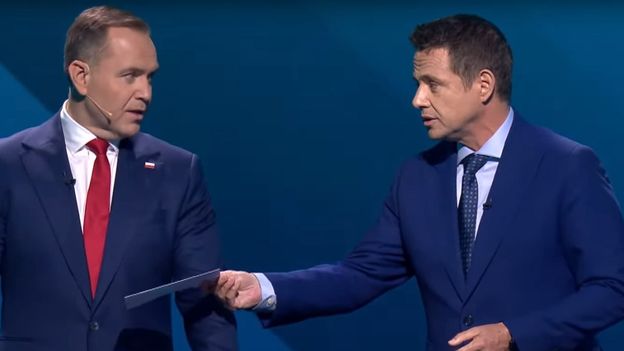 Na zakończenie poniedziałkowej telewizyjnej debaty kandydatów na prezydenta Trzaskowski wręczył Nawrockiemu kopertę, w której - jak się okazało dzień później - była kartka z numerem konta Domu Pomocy Społecznej, w którym przebywa Jerzy Ż., od którego Nawrocki nabył kawalerkę w Gdańsku. Trzaskowski informując o tym w mediach społecznościowych, opublikował skan tej kartki, na której widniały imię i nazwisko tego mężczyzny i nazwa DPS.