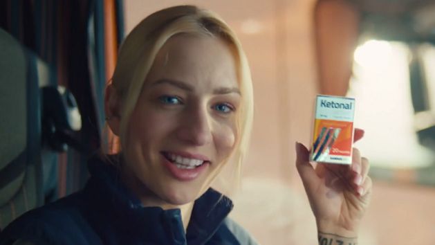 Bohaterką reklamy Ketonalu Active jest kobieta pracująca jako kierowca ciężarówki. Podkreśla, że musi być cały czas skupiona, a promowany lek pomaga jej zwalczyć różne typy bólu.