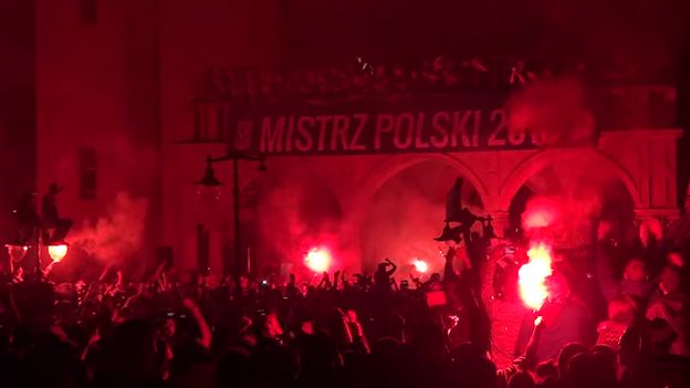 W niedzielę wieczorem kilkadziesiąt tysięcy świętujących mistrzostwo kibiców Lecha zebrało się na placu Adama Mickiewicza i jego okolicach. Niektórzy odpalali race, wchodzili na latarnie i pomnik Mickiewicza.