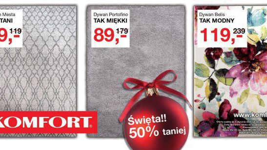 W ramach świątecznej akcji prosprzedażowej, Komfort promuje trzy nowe wzory dywanów (puszysty shaggy Portofino, orientalny Mesta o wzorze inspirowanym marokańską koniczyną, Belis ozdobiony kwiatowym wzorem) i zachęca rabatami 50%.