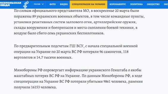 21 marca na stronie gazety (Kp.ru) pojawił się artykuł, w którym cytowano dane rosyjskiego Ministerstwa Obrony na temat rosyjskich ofiar wojny w Ukrainie od jej rozpoczęcia. Napisano, że podczas inwazji życie straciło 9861 rosyjskich żołnierzy, a 16153 zostało rannych.
