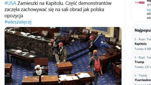 Po godz. 22 na twitterowym profilu TVP Info pojawił się wpis: „#USA Zamieszki na Kapitolu. Część demonstrantów zaczęła zachowywać się na sali obrad jak polska opozycja #wieszwięcej”.