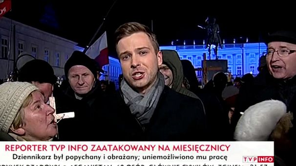 Tydzień temu uczestnicy obchodów miesięcznicy smoleńskiej przeszkodzili reporterowi TVP Info Radomirowi Witowi w przeprowadzeniu relacji sprzed Pałacu Prezydenckiego - krzyczano w jego stronę obraźliwe hasła oraz przerwano transmisję. Dziennikarzowi wyciągnięto słuchawkę z ucha, a sam został popchnięty przez dwóch uczestników miesięcznicy.