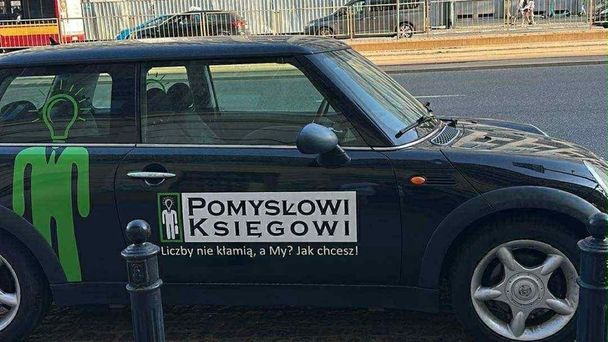 Zaparkowany samochód z logo Pomysłowych Księgowych, pod którym mniejszymi literami napisano: "Liczby nie kłamią, a My? Jak chcesz!". To reklama warszawskiego biura usług księgowych.