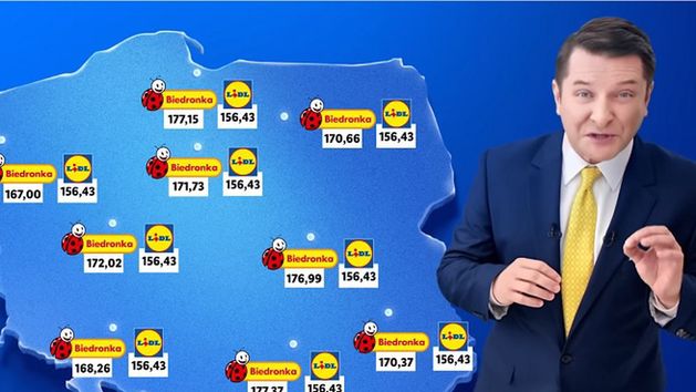 Prezenter podkreśla, że w różnych sklepach Biedronki są różne ceny koszyka tych samych 15 produktów, a różnica wartości tych koszyków wynosi ponad 15 zł. Tymczasem w sklepach Lidla, niezależnie od lokalizacji ceny są jednakowe i dodatkowo niższe niż w Biedronce.