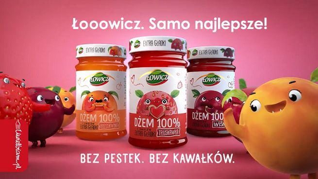 Kampania jest oparta na spocie pełnym żywych barw i w dynamicznej stylistyce. Pojawiają się w nim radosne dzieci, a owoce z różnych wersji smakowych dżemów Łowicz 100% z Owoców Extra Gładki wychodzą z etykietek i zaczynają rozrabiać.
