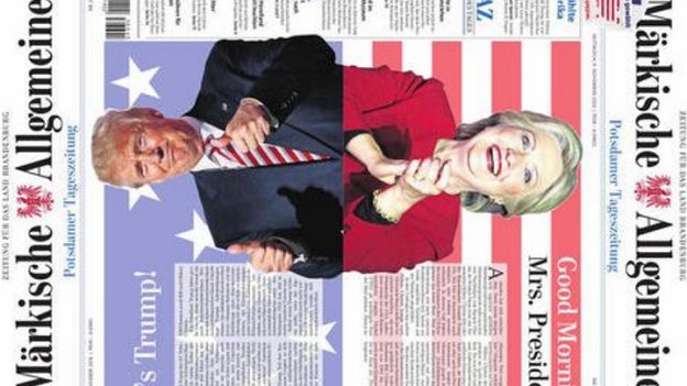 Środowe wydanie „Märkische Allgemeine Zeitung” ukazało się z podzieloną otwierającą stroną. Na jednej połówce umieszczono zdjęcie szczęśliwej Hillary Clinton opatrzone tytułem „Good Morning, Mrs. President!” sugerującym wyborcze zwycięstwo kandydatki demokratów.