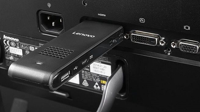 Ideacentre Stick 300 podłącza się do telewizora lub innego ekranu za pośrednictwem portu HDMI. Mysz i klawiaturę można podpiąć bezprzewodowo za pomocą Bluetooth lub kablem USB.
