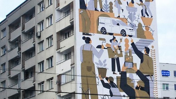 Powstały w centrum Warszawy mural został wykonany rękoma pięciu malarzy, którzy pracując w specjalnej windzie, w kilka dni przełożyli ilustrację Dawida Ryskiego na ścianę jedenastopiętrowego budynku, zużywając przy tym 120 litrów farby. W centrum kompozycji znajduje się nowy Volkswagen Caddy 5.