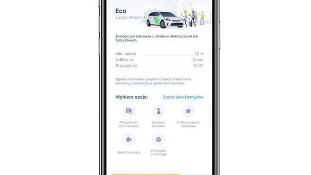 Aby zamówić ekologiczną taksówkę w mytaxi, należy po wpisaniu adresu docelowego wybrać opcję "Eco" spośród pozostałych pięciu klas usługi widocznych w dolnym menu na ekranie głównym aplikacji.
