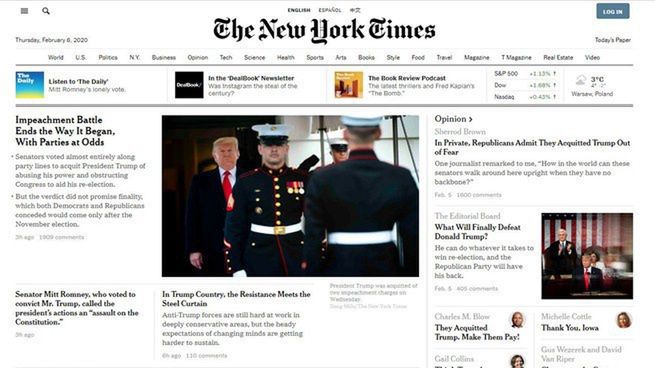 New York Times Company, która jest właścicielem "The New York Times", poinformowała w czwartek, że w 2019 r. gazecie przybyło ponad 1 mln cyfrowych subskrybentów. To największy wzrost w historii "NYT". Teraz firma ma 5 mln 251 tys. prenumeratorów wszystkich produktów w wersji papierowej i cyfrowej.