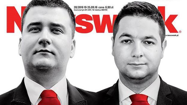 Fotomontaż na okładce nowego wydania „Newsweek Polska” pokazuje Bartłomieja Misiewicza i Patryka Jakiego z krawatami układającymi się w czerwony dywan na schodach. Grafika zapowiada tekst opisujący szybkie awanse obu polityków i zarzucający im nepotyzm.