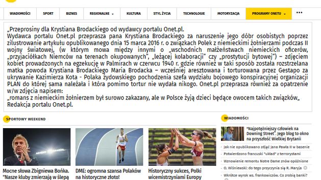 - Wydawca portalu Onet.pl przeprasza pana Krystiana Brodackiego za naruszenie jego dóbr osobistych poprzez zilustrowanie artykułu opublikowanego dnia 15 marca 2016 r. o związkach Polek z niemieckimi żołnierzami podczas II wojny światowej, (w którym mowa między innymi o „wschodnich małżeństwach niemieckich oficerów”, „przyjaciółkach Niemców na terenach okupowanych”, „leżącej kolaboracji” czy „prostytucji bytowej”) - zdjęciem kobiet prowadzonych na egzekucję w Palmirach w czerwcu 1940 r. gdzie również w taki sposób została rozstrzelana matka powoda Krystiana Brodackiego Maria Brodacka - wcześniej aresztowana i torturowana przez Gestapo za ukrywanie Kazimierza Kota - Polaka żydowskiego pochodzenia szefa wydziału bojowego konspiracyjnej organizacji PLAN do której sama należała i która pomimo tortur nie wydała nikogo - napisano.