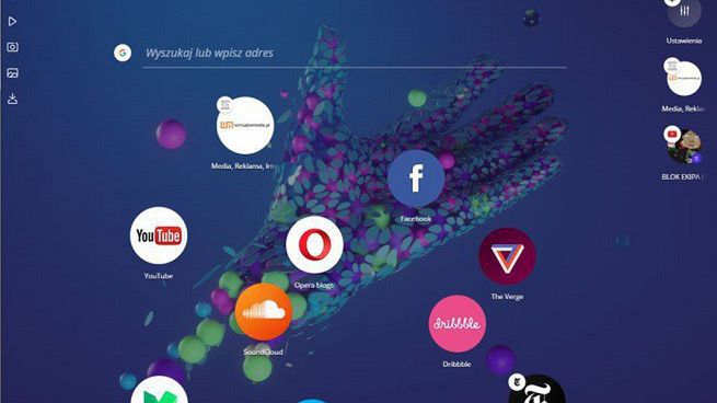W głównym oknie Opery Neon do dyspozycji użytkownika są lokalizacje w sieci dobrane na podstawie wcześniejszych zachowań internauty, wszystkie w postaci okrągłych ikon. Można wybrać jedną z tych sugestii, można też otworzyć nową stronę za pomocą wyszukiwarki (domyślna to Google, ale można ją zmienić w Ustawieniach).
