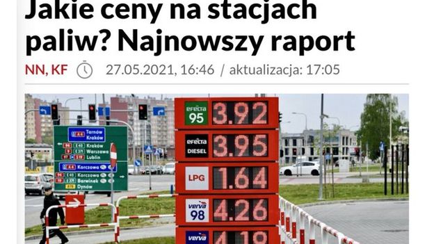 W czwartek po południu na TVP.info zamieszczono tekst „Jakie ceny na stacjach paliw? Najnowszy raport”. Jako główne zdjęcie zamieszczono przy nim archiwalną fotografię fotoreportera PAP przedstawiającą nośnik ze stacji paliw z cenami za różne typy benzyny wynoszącymi ok. 4 zł, a za LPG - 1,64 zł.